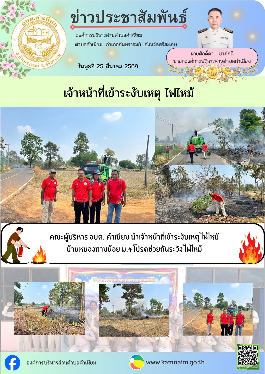 คณะผู้บริหาร อบต. คำเนียม นำเจ้าหน้าที่เข้าระงับเหตุ ไฟไหม้บ้านหนองทามน้อย ม.4 โปรดช่วยกันระวัง ไฟไหม้ ด้วยนะคะ