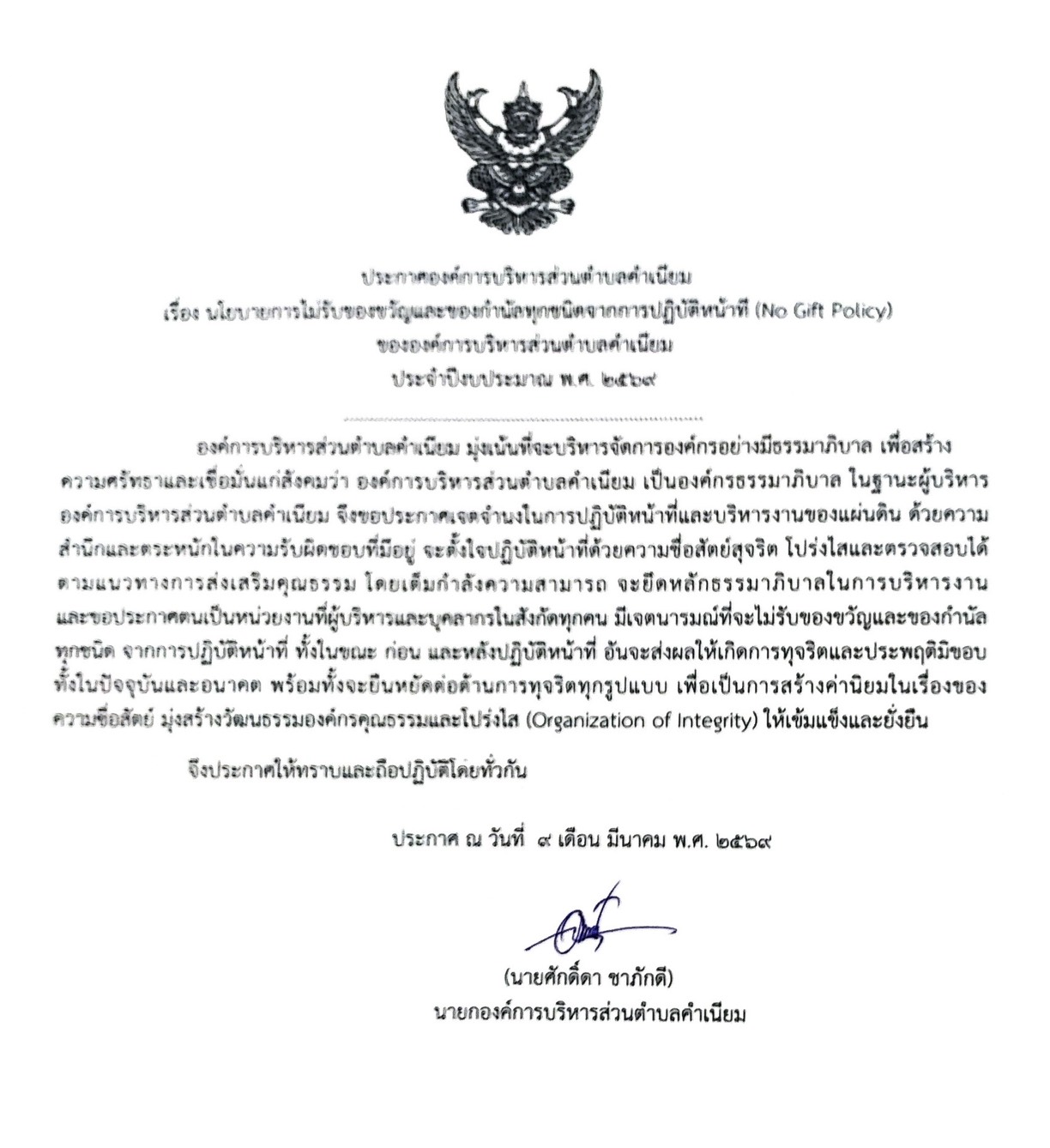 ประกาศเจตนารมณ์ นโยบายไม่รับของขวัญและของกำนัลทุกชนิดจากการปฏิบัติหน้าที่ (NO Gift Policy)2569(ภาษาไทย) |